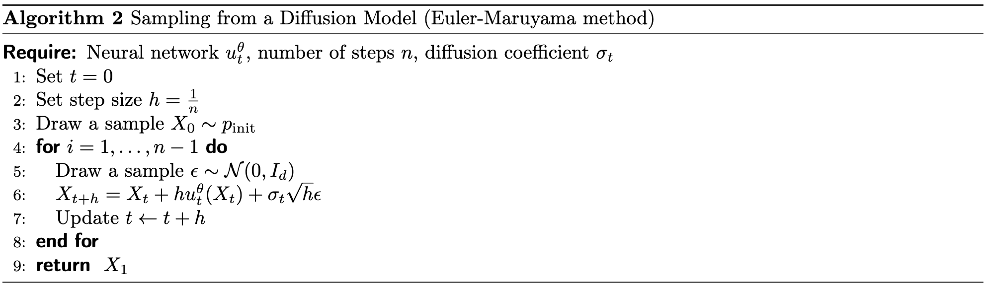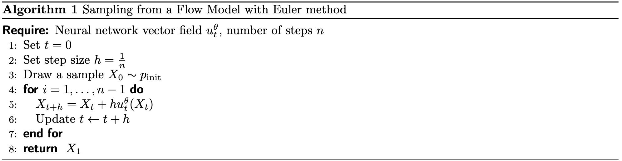 尽管我们把这个模型称为 flow model,但是神经网络参数化的内容是向量场,而不是流。如果我们要计算流,仍然需要模拟这个 ODE 才能得到整个 flow。下面,我们给出从 flow model 进行采样的算法: