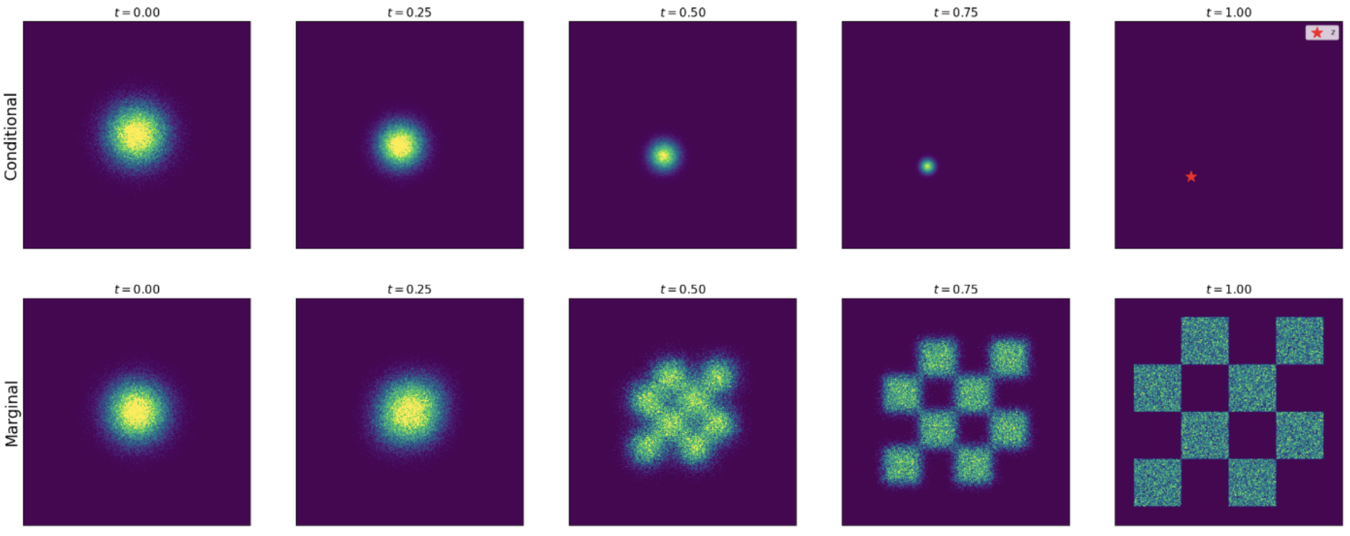 在越接近 \(t=0\) 的地方,这个过程加入的噪声更多,直到我们只剩下噪声。我们可以从下图直观地感受到条件概率路径和边际概率路径在高斯分布下的采样过程: