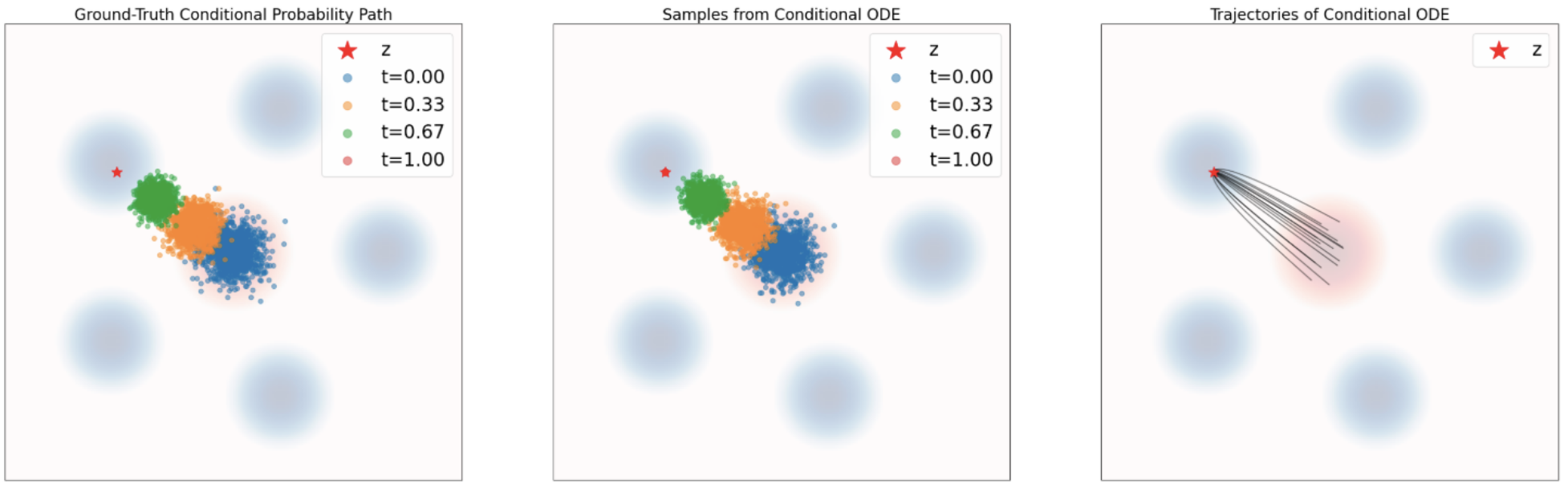 我们可以用这个向量场定义的 ODE 来模拟轨迹,它和实际的条件概率路径是相符合的。