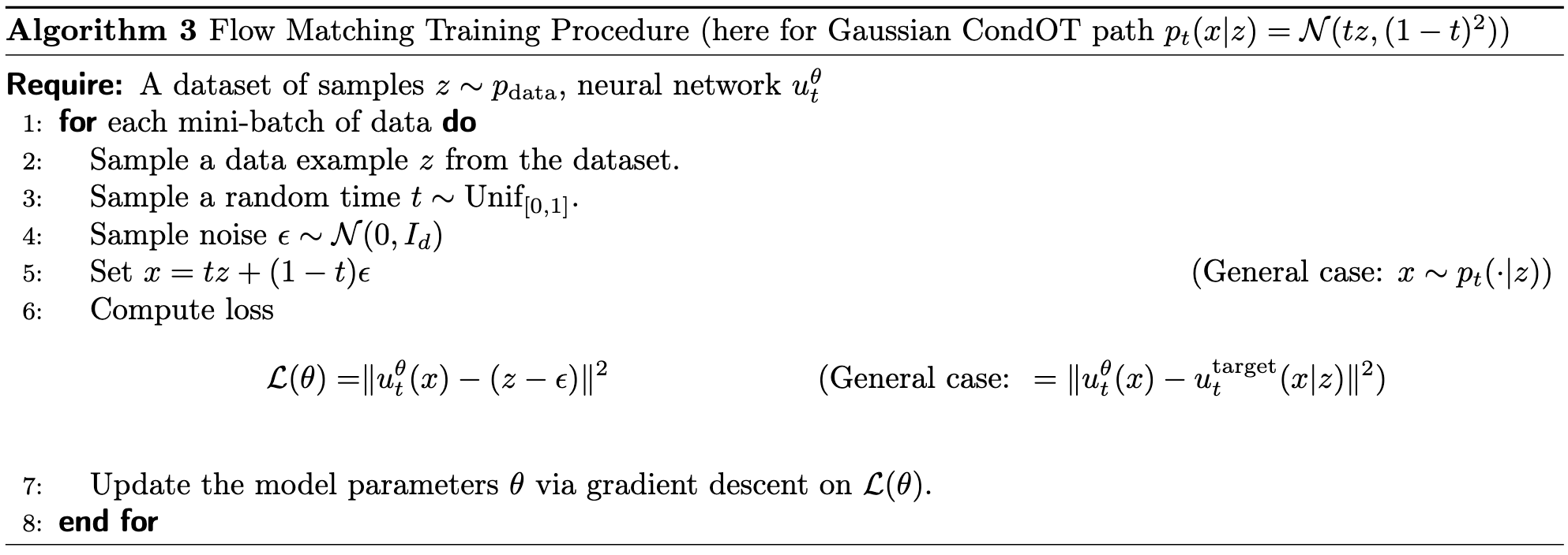 在前两节中,我们展示了如何构建一个生成模型,其向量场 \(u^\theta_t\) 由神经网络给出,并推导出了训练目标 \(u^{\text{target}}_t\) 的公式。本节中,我们将说明如何训练神经网络 \(u^\theta_t\) 来逼近训练目标 \(u^{\text{target}}_t\)。