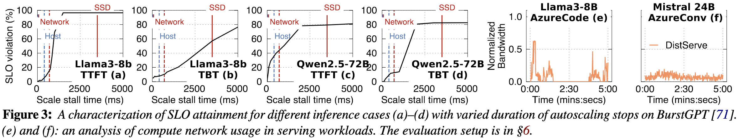自动扩容的时间是减少 SLO violation 的关键,即 cold-start latency 是我们的核心优化目标。如果服务拉起速度太慢,当请求激增时,由于系统的 throughput 并没有上升,而请求的 queue time 上升,排队的请求在实例扩容完成前都不能被推理,从而违反了 SLO.