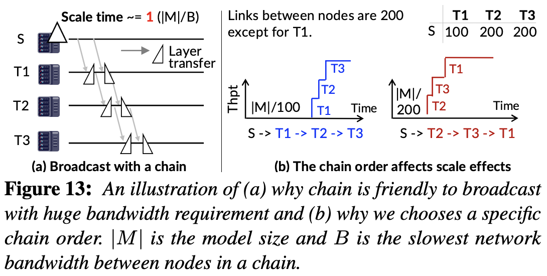 - 串行的广播链路 \(S\rightarrow T_1\rightarrow T_2 \rightarrow ... \rightarrow T_n\) 有很好的性质,在 bandwidth-intensive 的场景下,整体的传输时间和 scale 的模型个数无关。