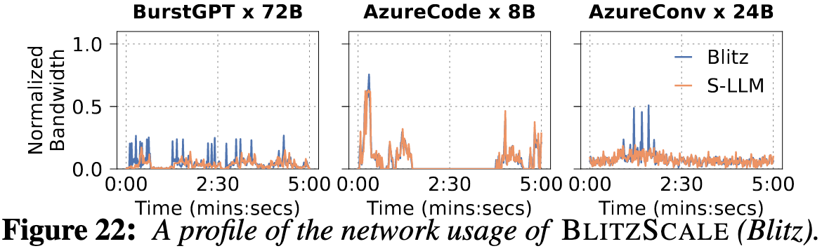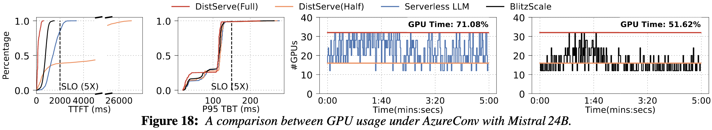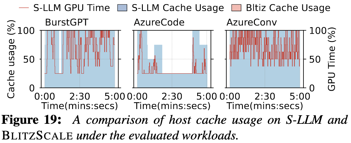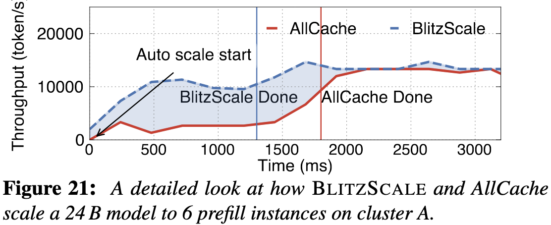 BLITZSCALE utilizes two broadcast chains (each involving 3 instances), while the end instances involve a live autoscale. The start instances are the decode instances. For AllCache, it directly loads the parameters from the host memory of the scaled instances. Second, BLITZSCALE can scale faster even compared with AllCache, thanks to our NVLink-based fused link transmission protocol: it can finish scaling in 1,200 ms while AllCache takes about 2,000 ms.