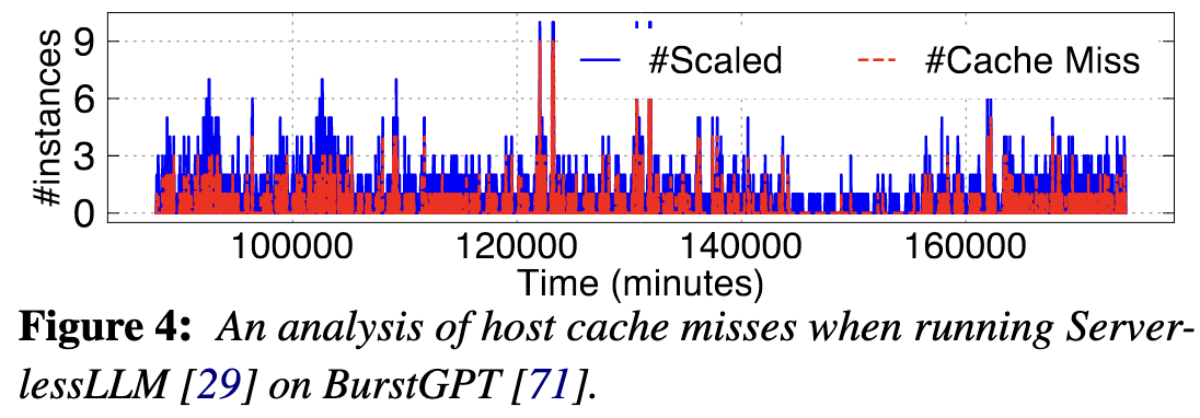 即使使用了 host cache,host 也不可能装下所有模型,因此不能完全避免缓存未命中带来的延迟。当 cache miss 时,模型加载速度就非常糟糕。同时,一个有意思的观察是,在 scale 的同时,由于负载被调度到了不同的 host,有更高概率带来 cache miss,从而导致 miss rate 飙升.