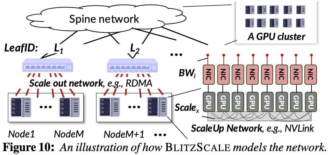 - 忽略二级以上交换机,采用 leaf-spine 结构。每个 GPU 与一台叶子交换机相连,拥有 \(BW_i\) 的带宽;叶子交换机内的通信是 full-mesh 的。