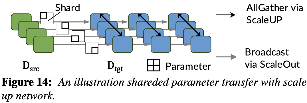 - 利用 scale-up 网络和 scale-out 网络的带宽差异,在分发参数的过程中,可以采用分片分发的方式,即从不同的 src 节点分别分发模型的一部分,聚合网络带宽;再利用卡间 scale-up 网络的 NVLink 带宽完成 All-gather 操作,从而加快模型参数传递速度。